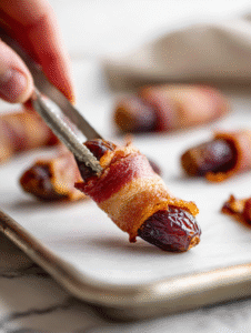 - Cut each bacon slice in half crosswise, then wrap each stuffed date tightly with a bacon piece, securing it with a toothpick.