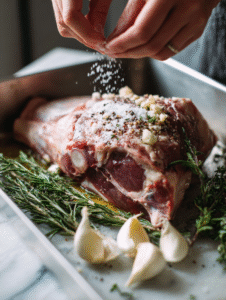 Step 2: Rub the lamb generously with a mixture of salt, pepper, and crushed garlic. Let sit for 30 minutes.