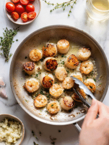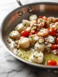 - Place the scallops and shrimp into the skillet, searing them until they develop a golden-brown crust, about 2 minutes per side for scallops and 3 minutes for shrimp, listening for a slight sizzle and watching for color change.