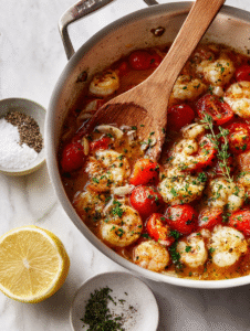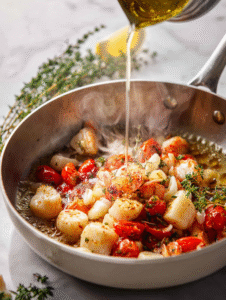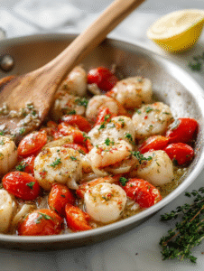Step 4: Pour in white wine or a splash of brandy, let it reduce for 2 minutes. Add cherry tomatoes, chopped herbs, and a squeeze of lemon, cook until everything melds—another 3 minutes.