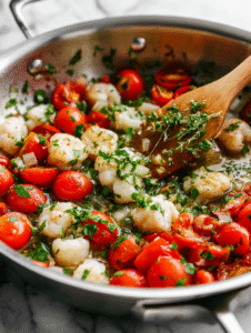 - Add halved cherry tomatoes, chopped parsley, chopped thyme, and a squeeze of lemon juice to the skillet, stirring gently to combine, and cook for another 3 minutes until everything melds and tomatoes soften slightly.