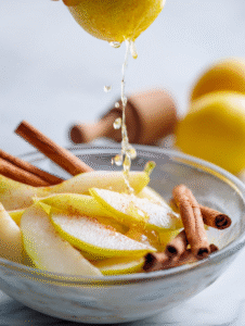 3. Squeeze fresh lemon juice from the lemon and pour it over the pear and cinnamon mixture. Muddle together gently until the pears are well mashed and fragrant.