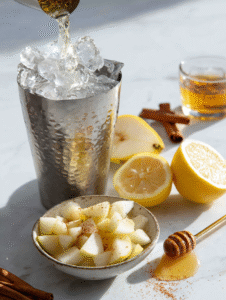 Step 2: In a shaker, muddle a ripe pear with a dash of cinnamon and a squeeze of lemon juice. Aim for a fragrant, oozy mash.