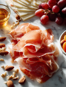 - Layer thin slices of prosciutto in a folded, ruffled pattern near the cheeses, adding a salty, smoky note to the spread.