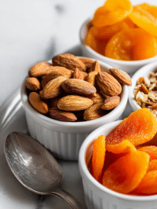 - Fill small bowls or ramekins with toasted almonds and dried apricot strips, placing them strategically for easy access and balance.
