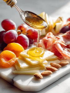 - Drizzle honey over the cheeses and fruits using a small spoon or squeeze bottle, adding a touch of sweetness and shine.