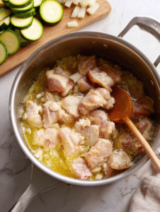 Step 2: Add a splash of olive oil, then toss in diced chicken thighs. Cook until golden, about 5 minutes, stirring occasionally.