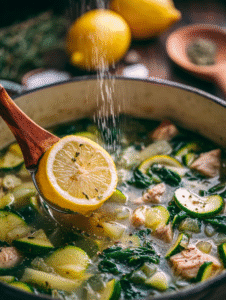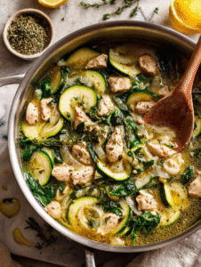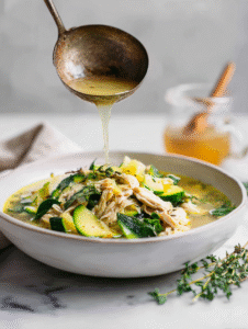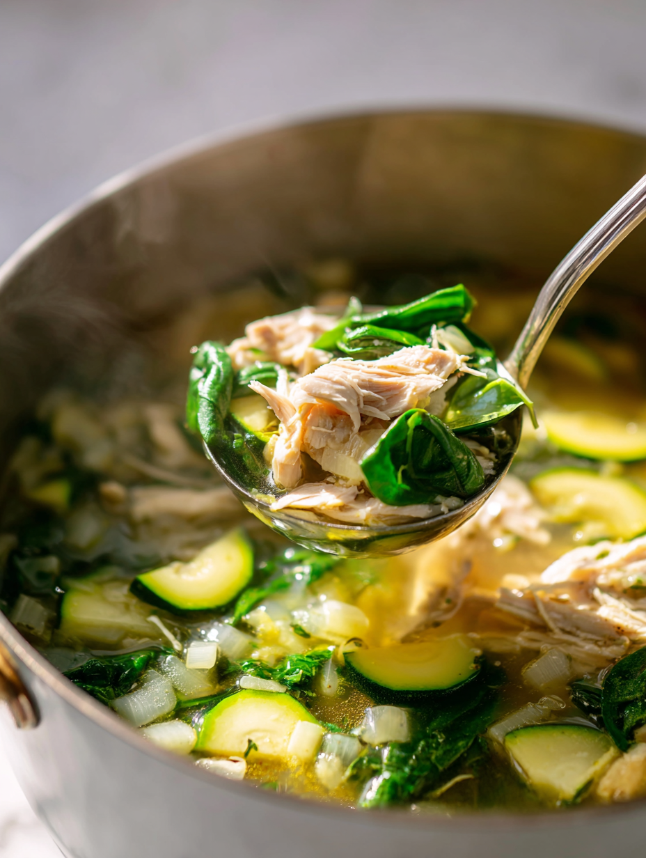 This keto-friendly chicken zucchini soup features tender chicken thighs simmered with fresh zucchini, spinach, and aromatic garlic and onion. Brightened with lemon juice, the soup has a clear, soothing broth with soft vegetables and juicy chicken, perfect for a comforting yet light meal. Its simple ingredients come together quickly, creating a clean and nourishing bowl.