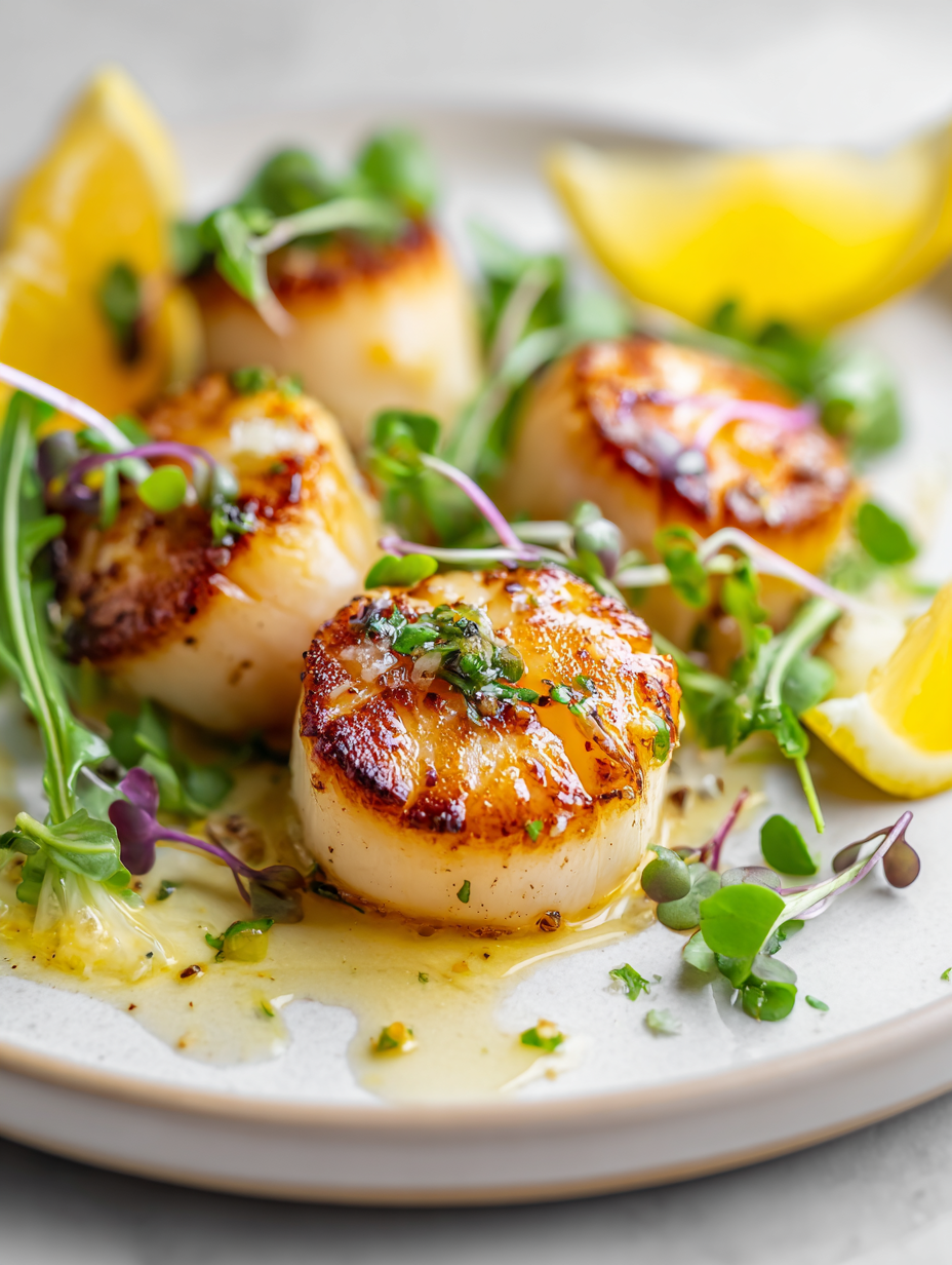 Let the scallops rest for 1 minute after cooking to allow juices to redistribute. Plate immediately with a squeeze of lemon and a sprinkle of finishing salt or herbs for visual appeal.