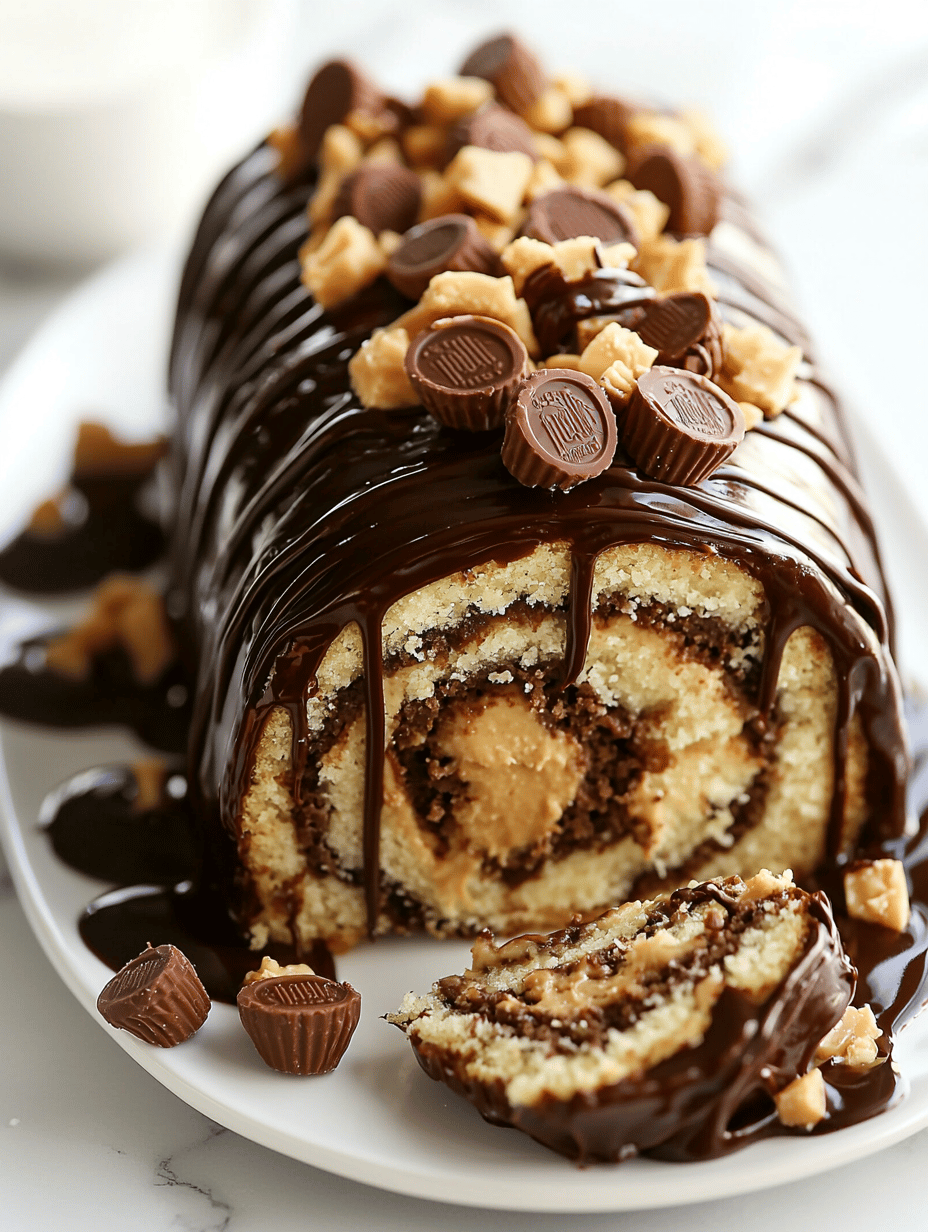 - Enjoy this decadent roll cake that combines the nostalgic flavor of peanut butter cups with the elegance of a rolled sponge, perfect for sharing at special occasions or as a comforting dessert.