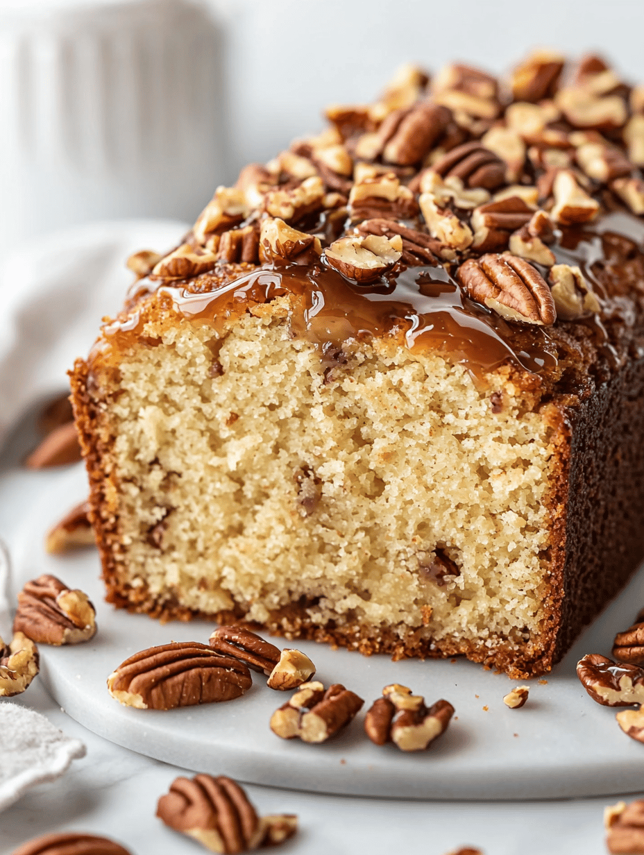 This pecan pound cake features a dense, tender crumb with a crunchy caramelized pecan topping. The batter is mixed and baked to develop a golden crust, resulting in a moist interior with a nutty flavor and rustic appearance.