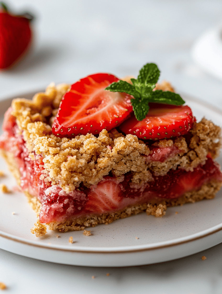 - Remove from the oven and let cool slightly before serving. The bars should have a crispy, golden crumble on top with a colorful, juicy strawberry filling inside.