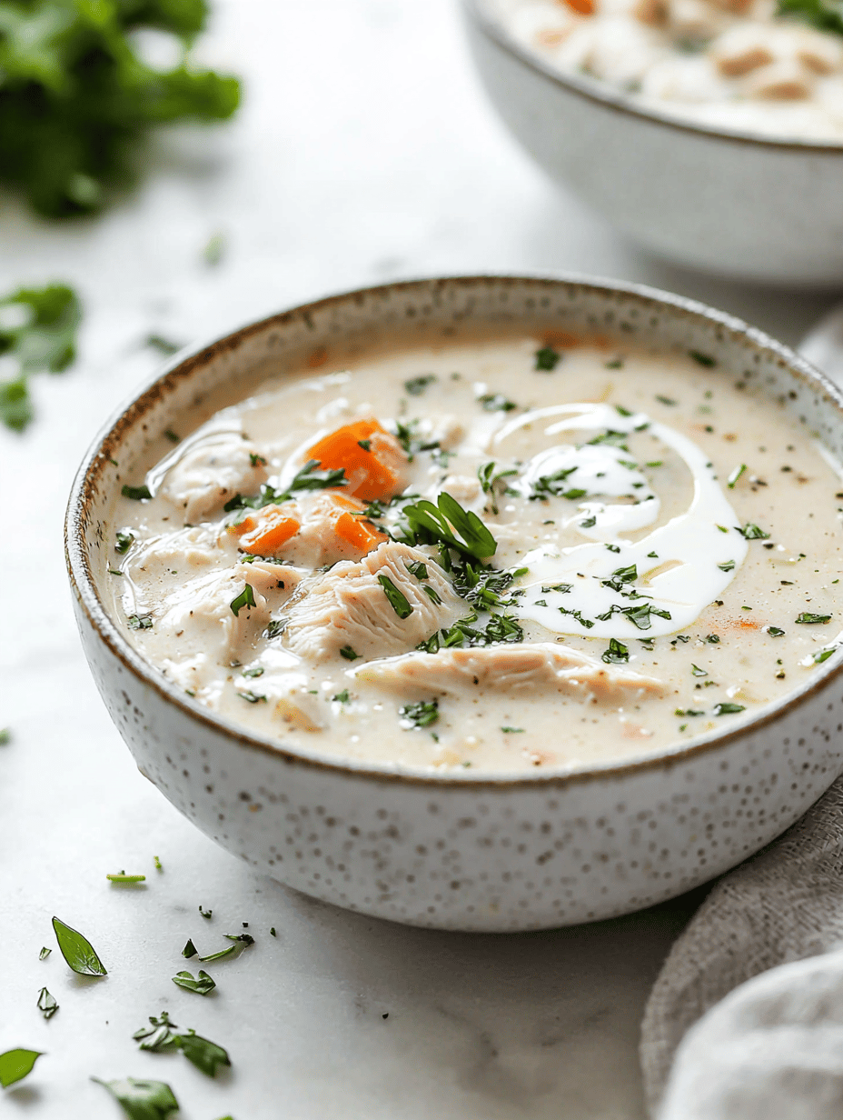 6. Serve the soup warm in bowls, enjoying the creamy texture and tender chicken pieces, accompanied by crusty bread if you like.