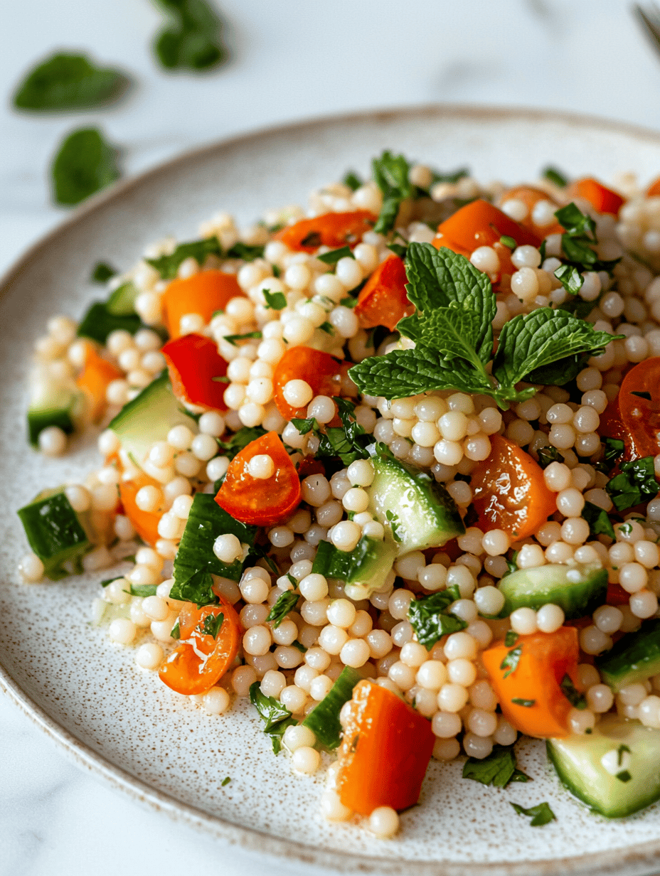 - In a large mixing bowl, combine the toasted couscous, cherry tomatoes, minced garlic, diced cucumber, and chopped herbs. Drizzle with lemon juice and olive oil, then add balsamic vinegar if using. Toss gently to evenly coat all ingredients.1 cup pearl couscous, 1 cup cherry tomatoes, 1/2 cup finely chopped fresh herbs, 1 lemon lemon, 1 clove garlic, 1 cup cucumber, 1/4 cup toasted pine nuts, 2 tbsp balsamic vinegar